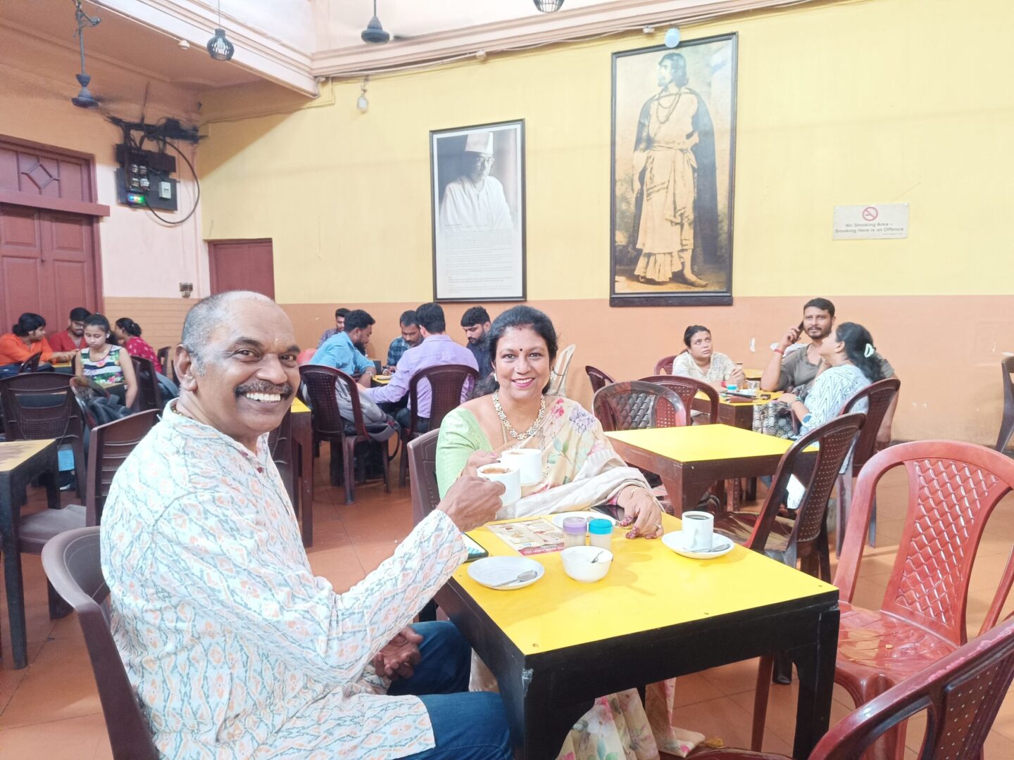 The interior maintains its old-world charm with vintage wooden furniture, simple tables and chairs arranged for communal dining, and archaic ceiling fans that have witnessed decades of conversations. The walls are adorned with portraits of literary giants, including a prominent photograph of Rabindranath Tagore, India’s first Nobel laureate in Literature.